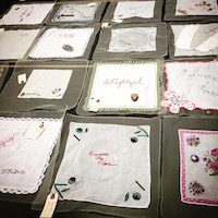 This project was an opportunity to bring the community into the fold of a larger work called “The Inheritance Project” – an examination of contemporary value within inherited women’s handwork, during which the artist spent 13 months crowdsourcing cast-off vintage linens and accompanying narratives to ultimately become the final inheritor of over 600 handmade objects. A portion of this “inheritance” — 80 linen handkerchiefs – became the substrate for “Needle and Myth,” while the process became the conduit for collective memory through re-embroidery and creating a safe space for sharing personal or family narrative in small group settings.
