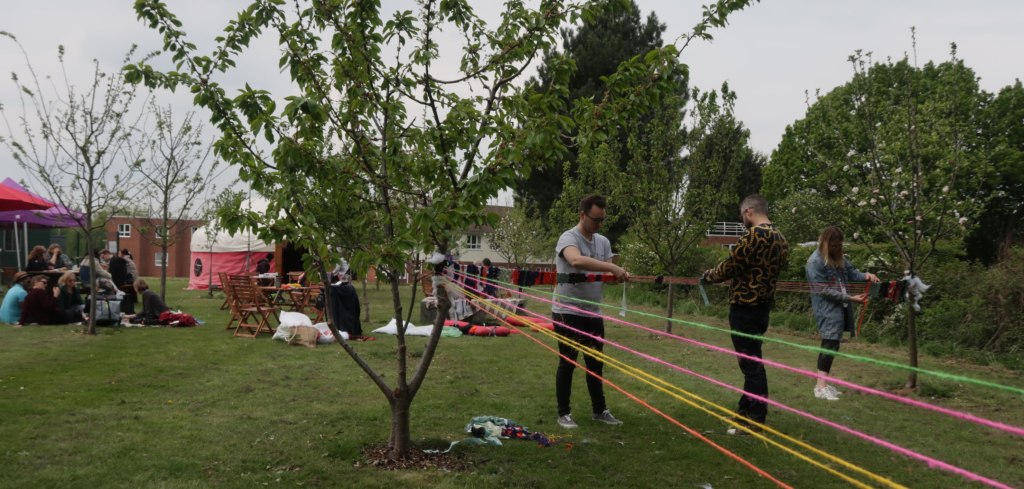 Fruit Routes is an artist-led initiative seeking to develop Loughborough University as an edible landscape, and hopes to share knowledge with the university and wider community through creative events, participation and mapping. As part of the 2019 Fruit Routes programme, Daniel ran a site-specific project ‘Weaving The Orchard’ on 1st May. Daniel used recycled and natural materials to create a huge weaving between the apple trees, drawing people’s attention to the site and the abundance of materials that go to waste. Many students and University staff joined in, none of whom had experience in textiles or weaving practices, and the installation became a real talking point and a site for skill-sharing.