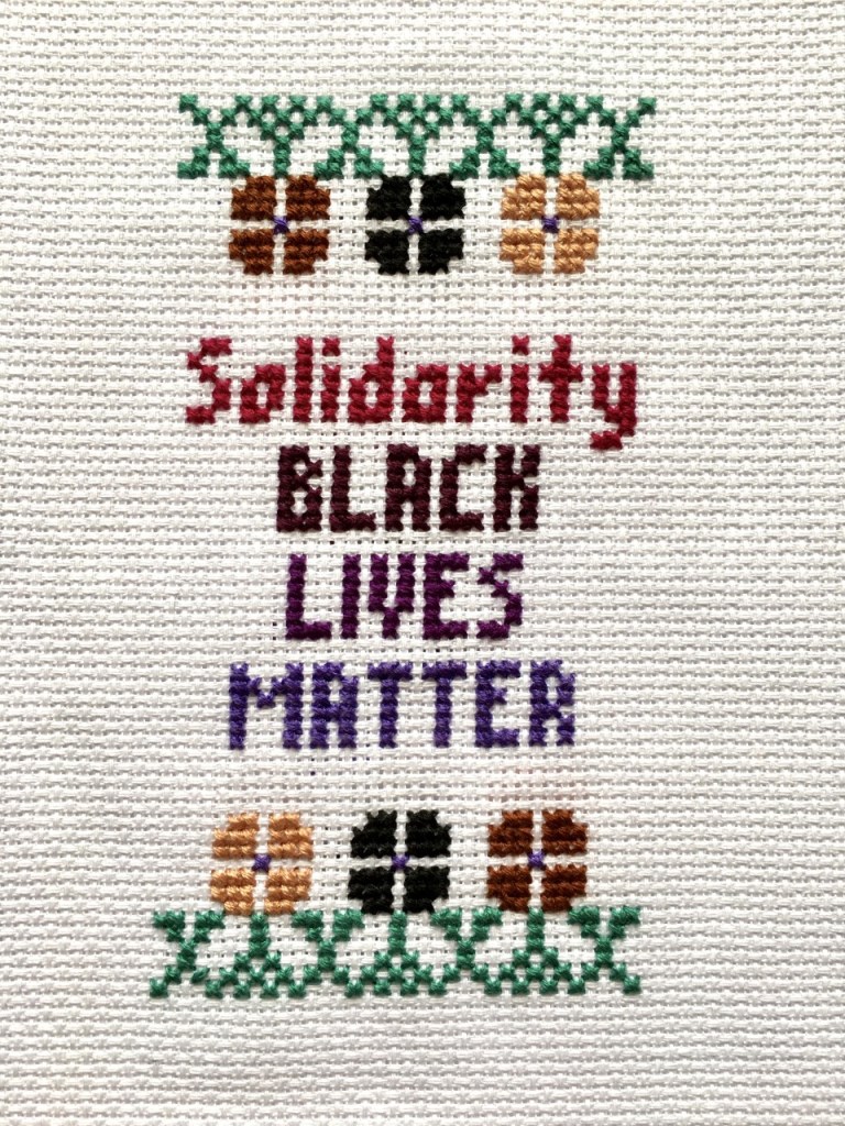 Antoinette’s first cross-stitch project was a contemporary sampler (stitched area 291x357mm) that she designed and sewed as she wrote her PhD thesis. When COVID-19 hit, plans to continue develop her research-based art practice of guerrilla street theatre came to an abrupt halt. Exploring solidarity as a politicised and participatory practice needed a disciple shift into textiles.