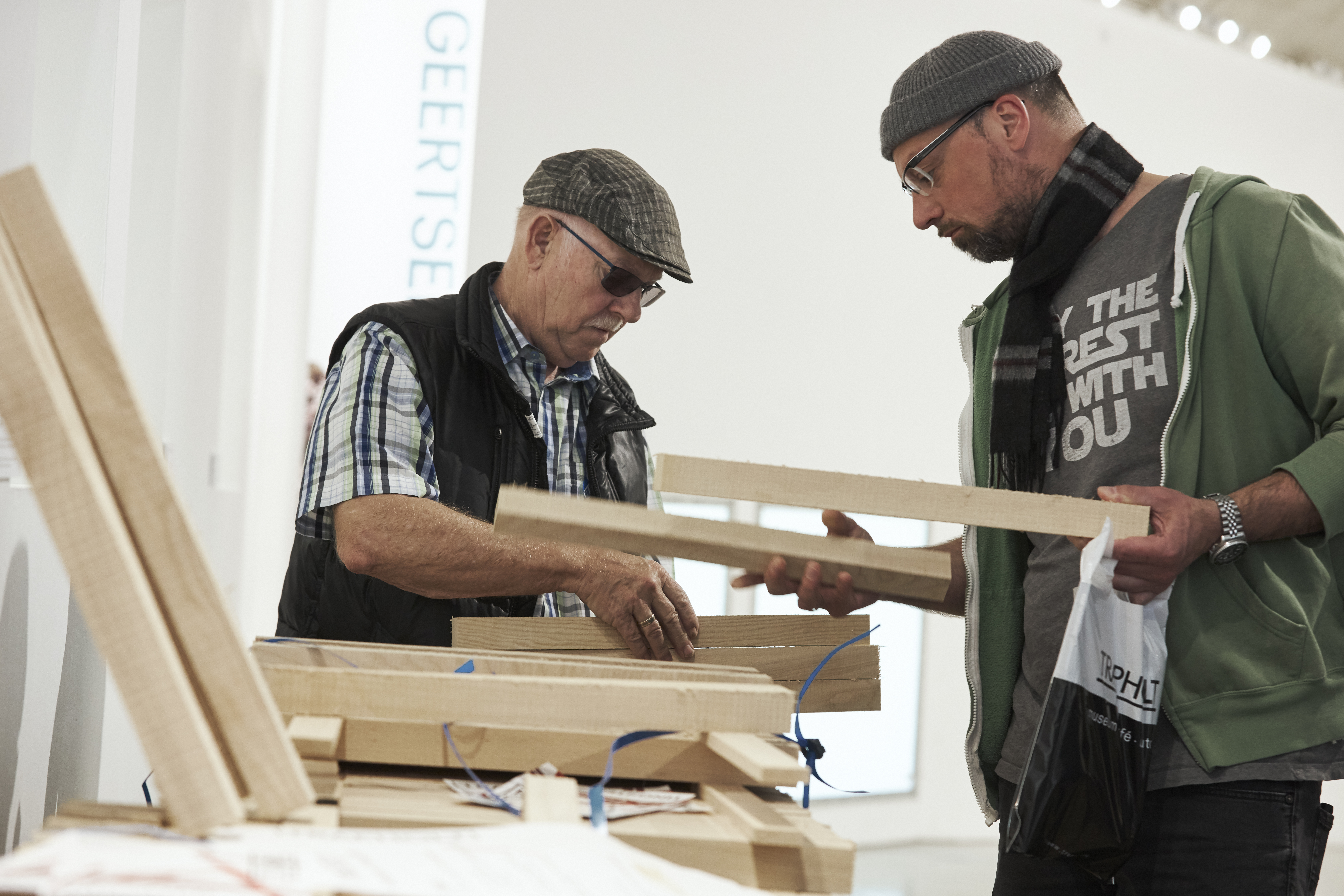 In Thingstead (Artist: Rasmus Bækkel Fex, 2019-20) 300 woodturners turned 1000 sticks into an installation resembling 12 chairs at a historic thingstead.