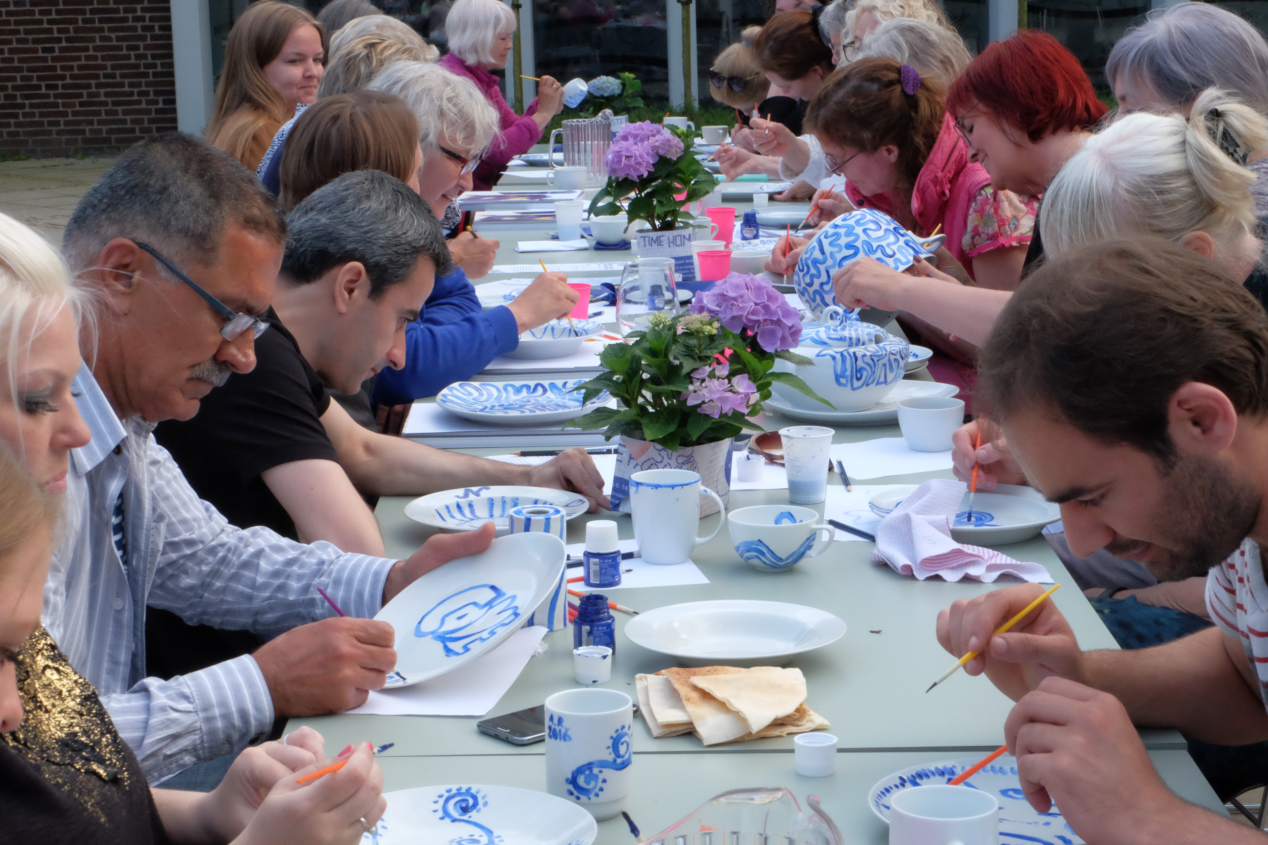 In Waste Time (Artist: Anja Franke, 2016-17) 800 participants from seven towns met with Syrian refugees. Syrians contributed with cooking and Danes contributed with white porcelain. After eating together from the porcelain, everybody coloured it with a blue doodle pattern while discussing waste and loss. The porcelain became an installation at Trapholt.